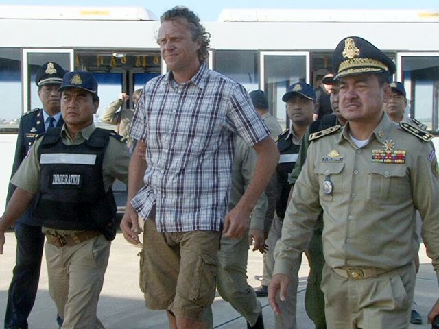 Фото: AFP / Scanpix Сергей Полонский в сопровождении камбоджийской полиции в аэропорту Пномпеня. 17 мая 2015 года