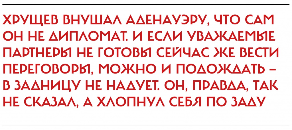 Частично он был прав. Как известно, в СССР на дипслужбу ссылали неугодных партфункционеров. Хрущев, как и его учитель Сталин, играл с людьми, а иногда и с народами в «кошки-мышки»: прижмет — отпустит. Пока не сожрет. Это был почти обязательный советский ритуал. Немцы как побежденная нация должны были ему следовать. Но не последовали. И это взбесило Никиту Сергеевича. Судьбы пленных он вообще в расчет не брал. И искренне удивлялся, почему это так волнует канцлера.