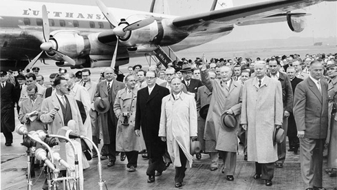Аденауэр вернулся из Москвы с подписанным договором об установлении дипломатических отношений, аэропорт Кельна, 14 сентября 1955 года