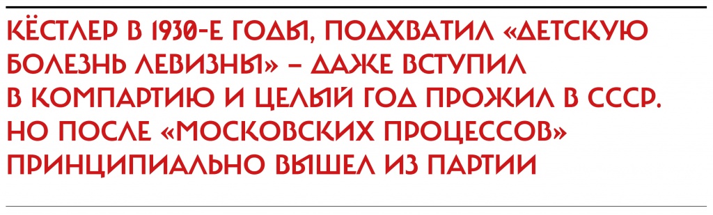 Его биографии хватило бы на пару приключенческих фильмов. Венгерский еврей, в юности не знавший ни слова по-английски, к сорока годам стал известным английским прозаиком и публицистом, к семидесяти — кавалером Ордена Британской империи и кандидатом на Нобелевскую премию по литературе. В молодости он защищал республиканцев в Испании (был пойман франкистами, обвинен в шпионаже, приговорен к смерти, чудом спасся). Затем вступил во французский Иностранный легион, откуда дезертировал, чтобы попасть в Англию. Участвовал в сионистском движении и был членом кибуца в Палестине. Совершил полет к Северному полюсу на дирижабле «Граф Цеппелин». В начале Второй мировой войны сразу записался добровольцем в британскую армию и одновременно вел пропагандистские антинацистские программы на Би-Би-Си. А еще Кёстлер, как и многие коллеги-журналисты в 1930-е годы, подхватил «детскую болезнь левизны» — даже вступил в компартию и целый год прожил в СССР. Но после «московских процессов» принципиально вышел из партии, жестоко разочаровавшись в левых идеях.