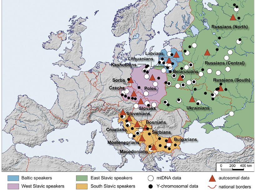 Стремясь уточнить взаимоотношения восточных и западных славян с одной стороны и южных славян с другой, ученые сравнили степень их близости по фрагментам генома, унаследованным от общего предка (IBD – identical by descent), одновременно они сравнили их и с окружающими народами Европы. В итоге им удалось обнаружить значительную степень генетического сходства этих двух групп славян, но одновременно было выявлено значительное влияние на генофонд западных и восточных славян других народов севера Восточной Европы. Были определены также два типа субстрата – генетических следов дославянского населения в генофонде славян. У западных и восточных славян, например, высока частота гаплогруппы R1a по Y-хромосоме, а у южных – гаплогруппы I2a.