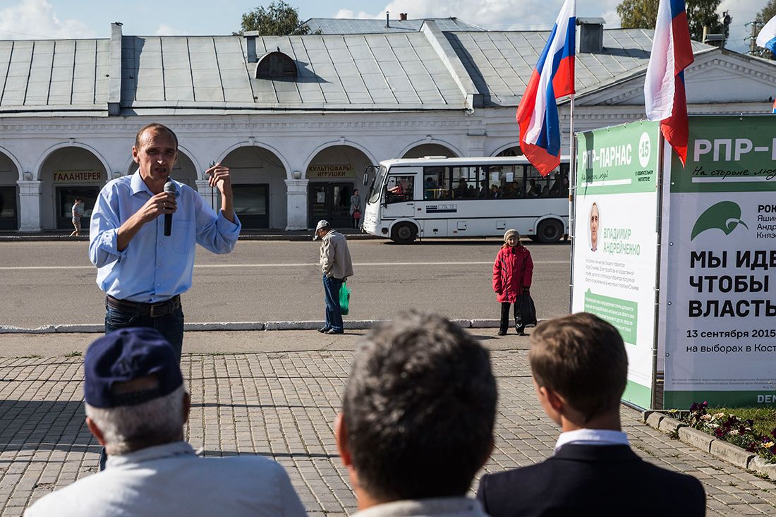 «Парнас», как того требует закон, выдвинул в областную думу полноценный список, однако избирательную кампанию ведут только два человека. Кроме Яшина по дворам Костромы ходит бывший замгубернатора Костромской области Владимир Андрейченко. Его шансы попасть в парламент невелики — для этого список должен получить 10% (в Костромскую областную думу 18 депутатов избираются по партийным спискам, еще 18 — по одномандатным округам).
