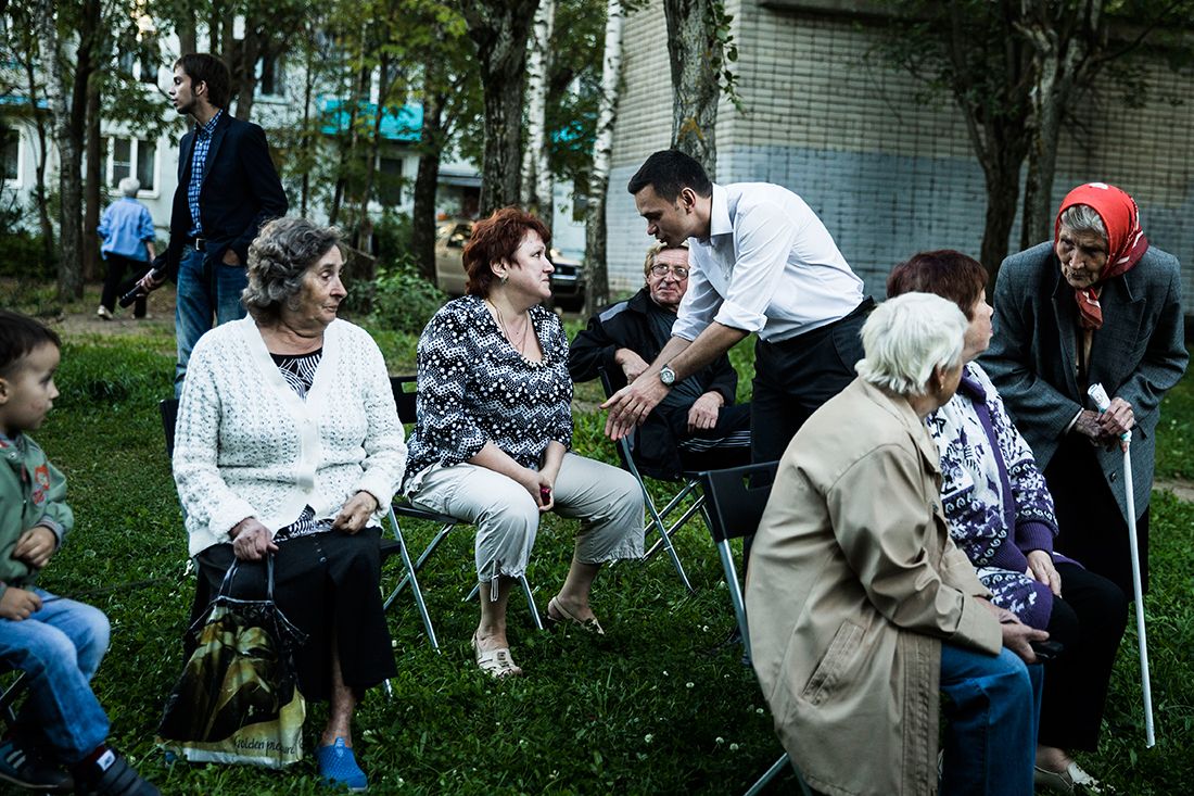 — Здравствуйте, Илья Яшин, — представляется кандидат в депутаты и здоровается с пенсионером за руку.