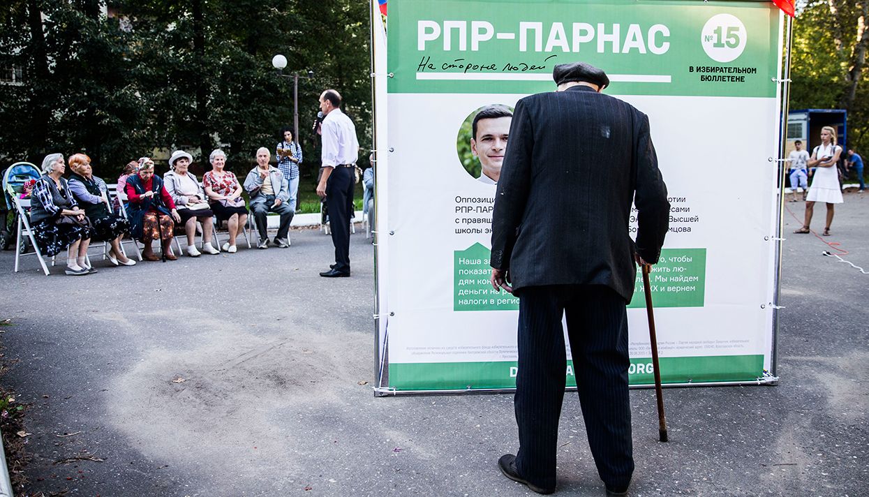Десять минут назад во дворе на детской площадке с жителями дома общался Яшин. В день он (как и № 2 в списке «Парнаса», местный политик Владимир Андрейченко) проводит пять встреч. Перед каждой из них во дворе — или на площади в райцентрах, куда кандидаты ездят на выходных — ставят раскладные белые стульчики для пожилых, а также агитационный куб с биографиями двух кандидатов «Парнаса» и их требованиями. Из колонок играет спокойная музыка, которая иногда прерывается призывом к жителям окружающих домов приходить на встречу.