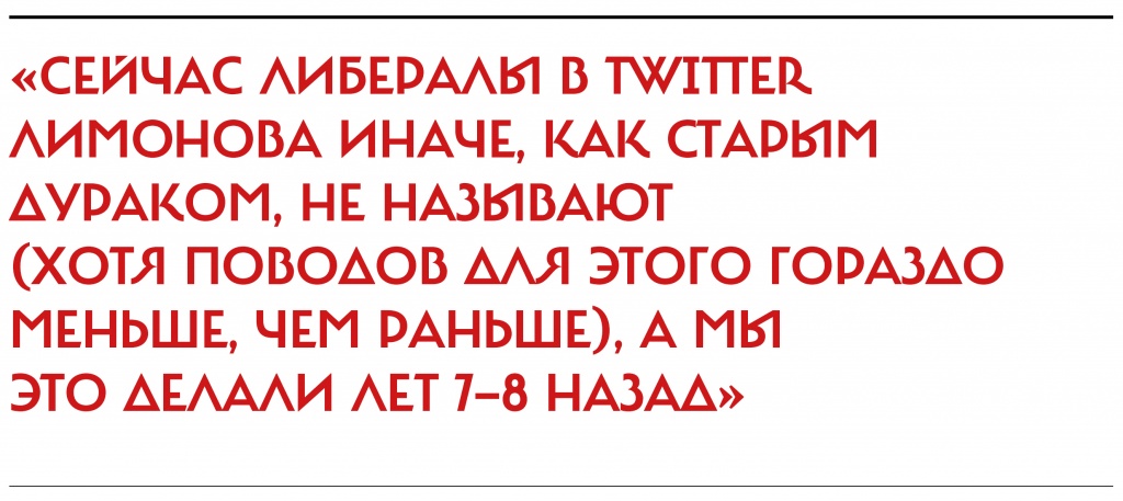 Простите, пример с Лимоновым непонятен. Я хочу сказать, что сейчас либералы в Twitter Лимонова иначе, как старым дураком, не называют (хотя поводов для этого гораздо меньше, чем раньше), а мы это делали лет 7–8 назад. Вот и получается, что тогда мы опередили время и с точки зрения нынешней рукопожатной общественности были правы.