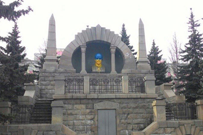 Синяя и желтая краска, похоже, наносилась из баллончика. Новый облик бюста, установленного в центре города, открылся прохожим утром. На этот раз неизвестные раскрасили только голову вождя мирового пролетариата.