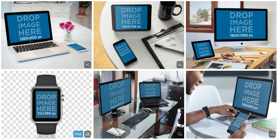 Сервис позволяет фильтровать мокапы по типу устройств или найти нужные по встроенным тегам. После выбора мокапа нужно загрузить свое изображение, которое появится на месте надписи Drop image here.