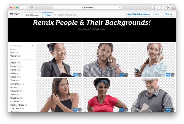 Placeit предоставляет бесплатный доступ к разделу, где можно смиксовать изображения людей и задний фон. Бесплатно полученный результат можно скачать в размере 600х212 пикселей.