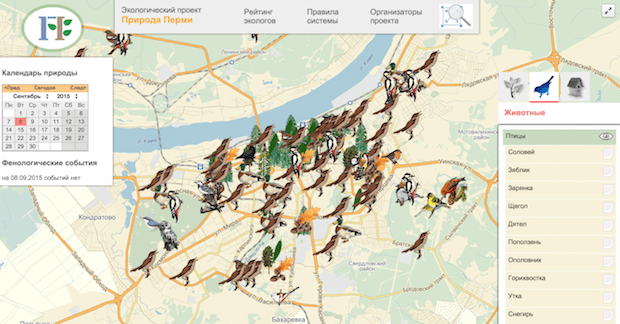 Сервис представляет собой интерактивную карту, на которой собрана информация о природе и животном мире Пермского края. Любой пользователь может стать участником проекта. На сайте также есть информация о сезонных явлениях и событиях, связанных с ними. Календарь прилета и отлета птиц, цветение растений в Перми и многое другое.