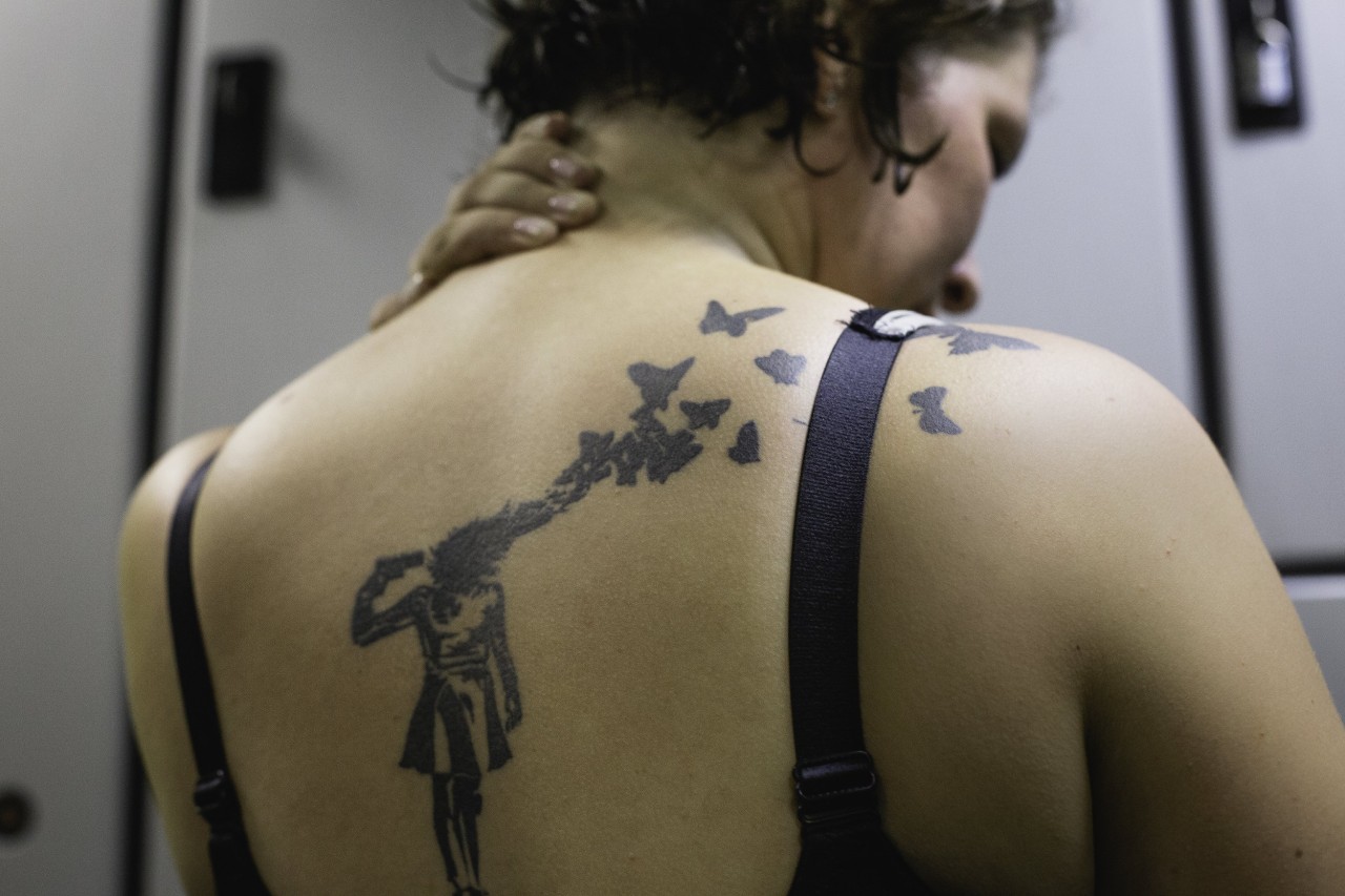 У Вики на спине сделана татуировка с граффити английского уличного художника Бэнкси. «Чтобы добиться совершенства, надо вынести себе мозг», — говорит она.Фото: Ксения Иванова для ТД