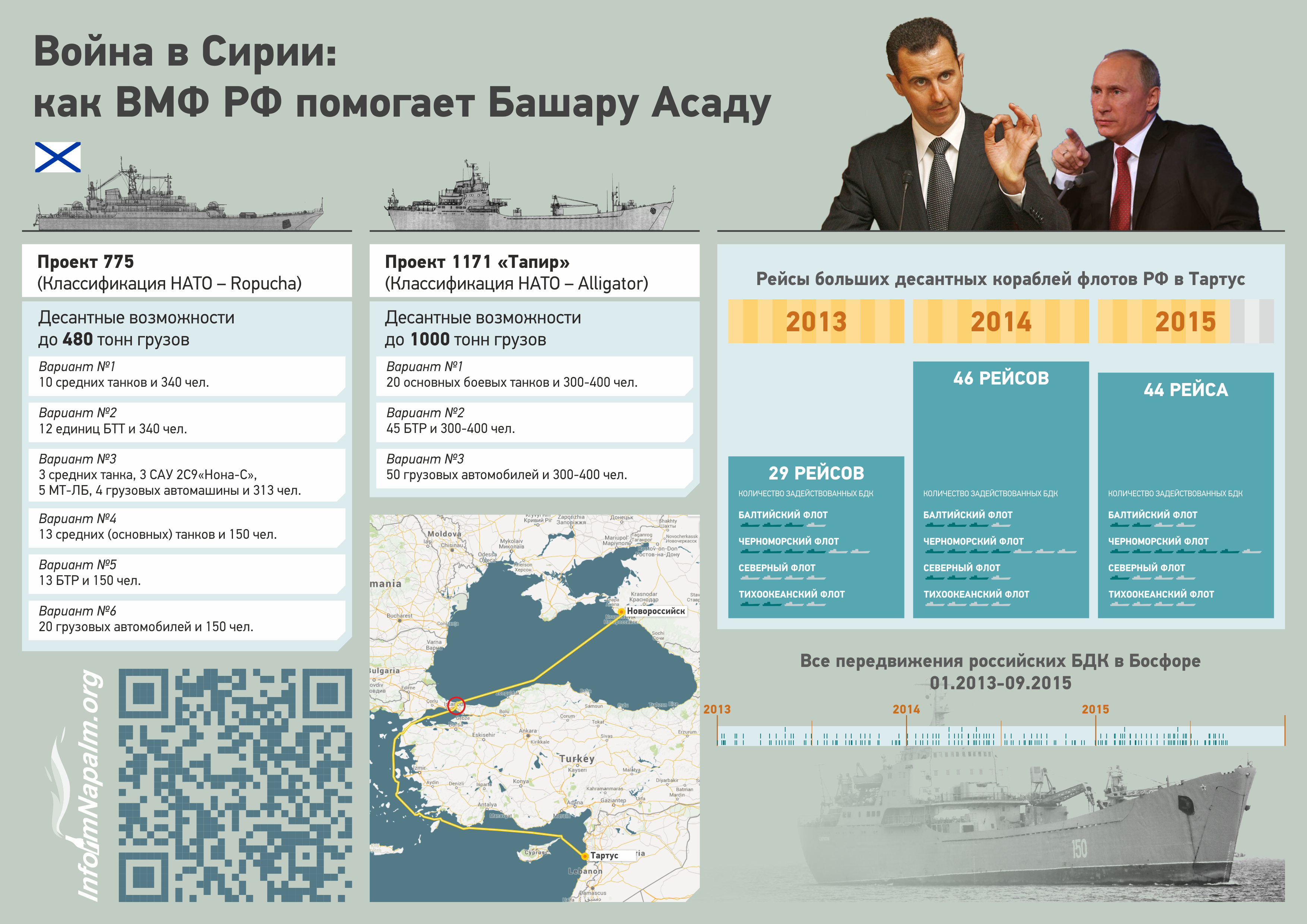 Как бы ни обстояло дело в реальности, именно поддержка России в последние 5 лет позволила Башару Асаду и подконтрольным ему силам одновременно бороться сразу с несколькими соперниками – сирийскими повстанцами, умеренными исламистами, сирийскими курдами и "ИГИЛ" – и при этом не потерпеть окончательного поражения. Так считает Антон Павлушко, один из активистов волонтерского проекта InformNapalm, цель которого – выявлять в открытых источниках и предавать гласности доказательства российской милитаристской активности на Украине, в Сирии и других странах мира. По словам Павлушко, Москва в последнее время резко нарастила объем военной помощи Дамаску – об этом можно судить по статистике проходов больших российских десантных кораблей через Босфор за последние годы и их загруженности: