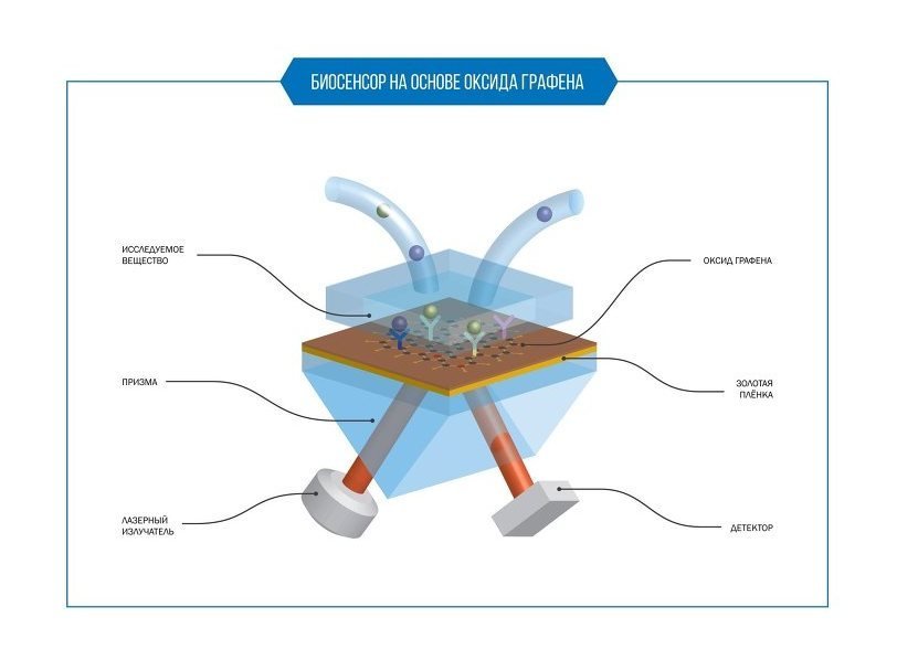 Работа современных безмаркерных биосенсоров основана на использовании плазмонов – электромагнитных колебаний на границе проводника и диэлектрика. Современные сенсорные чипы представляют собой пластинки из стекла, покрытого тонким слоем золота. На сенсор наносится слой полимера или тиолов. В новом сенсорном чипе над слоем золота толщиной 35 нанометров располагается оксид графена, а поверх него белок стрептавидин, который служит ловушкой для молекул. Направленное на чип лазерное излучение вызывает появление плазмонов, а фотодетектор определяет минимальные изменения в них, вызванные молекулами исследуемого вещества. Биосенсоры позволяют прослеживать ход химической реакции лекарственного препарата с живыми клетками, что значительно облегчает работу по созданию новых лекарств.