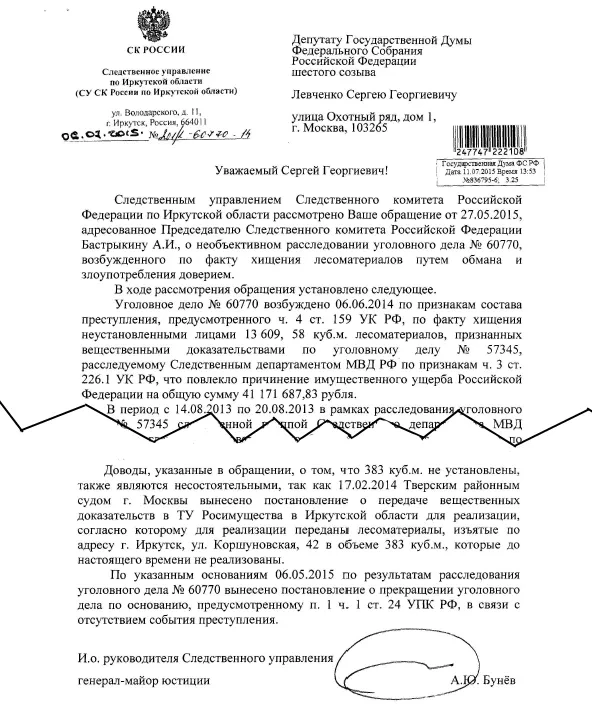 Через две недели Левченко получил ответ, подписанный руководителем иркутского управления СКР генералом Андреем Буневым. В ответе генерал старательно переписал постановление о прекращении уголовного дела № 60770, так и не опровергнув доводы, приведенные в запросе депутата Госдумы.