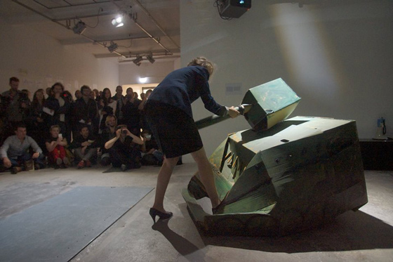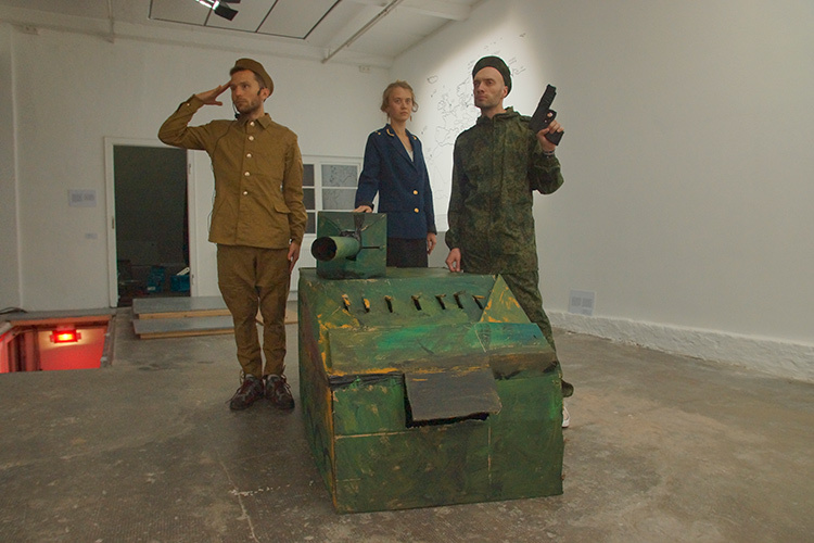 © Roel Weenink ередовое удожество. Вы часть нас! Реэнакмент аншлюса Крыма, 2015 Вообще тема скрытой войны между Россией и Украиной оказалась важна для сегодняшнего руководства академии — не только потому, что это то, о чем все время говорят в СМИ, и разговора об этом не избежать, не только потому, что у Екатерины Деготь и ее постоянного сокуратора Давида Риффа есть потребность высказывать свою позицию по политическим вопросам, но и по той достаточно простой причине, что назначение Деготь художественным директором Академии мирового искусства совпало по времени с аннексией Крыма — март 2014 года (в похожей ситуации оказались и российские кураторы, создавшие резиденцию Бükü в Лейпциге). Для Деготь и Риффа такое совпадение не стало чем-то, что заставляет дежурно реагировать, — они посчитали, что сами хотят и должны высказаться. На открытии Pluriversale III Деготь говорила об ответственности за происходящее на Востоке Украины, которую она ощущает, будучи гражданином России. Впрочем, кураторы взяли некоторый тайм-аут и на первых двух Pluriversale обсуждали другие проблемы, не менее животрепещущие для Европы, — ту же тему миграции, которая не осталась без упоминания и в рамках нынешнего выпуска (в европейских СМИ этот вопрос сейчас даже затмил обсуждение российско-украинского конфликта).