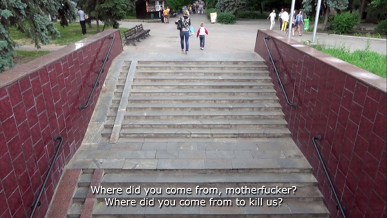 Николай Ридный. Обычные места, 2014. Видео Алексей Радинский из Киева и Томаш Рафа из Варшавы (оба — авторы журнала «Политическая критика») представили на выставке в академии итог своей поездки в Донбасс в первые дни образования ДНР и ЛНР, когда боевые действия еще толком не начались, но настроения на улице уже вели к кровопролитию. Им пришлось законспирироваться, правда, в тот момент проверка была не особо серьезной и в Донбасс можно было более-менее легко попасть с территорий, контролируемых правительством Украины. Они ездят по городам, наблюдают манифестации и обычную жизнь, общаются с местными активистами-сепаратистами, которые, если послушать внимательно, делают взаимоисключающие утверждения. Состояние невообразимой противоречивости соседствует с полной уверенностью в правильности отделения и конфронтации с Украиной. Это еще не война, но ретроспективно, после увиденного и услышанного, она видится неизбежной, даже если на минуту поверить, что тогда что-то можно было изменить.