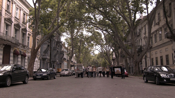 © Courtesy of AKADEMIE DER KÜNSTE DER WELT Юрий Лейдерман, Андрей Сильвестров. Одесса, фрагмент 205. Видео, 2015 Фильм известного одесского художника Юрия Лейдермана и режиссера из Москвы Андрея Сильвестрова «Одесса, Фрагмент 205» сделан специально для Pluriversale III. Позже его показали на Киевской школе, с которой у Академии мирового искусства партнерские отношения. Художники, люди из околохудожественной тусовки, приглашенные колоритные статисты (один из них даже умудрился так сыграть, что авторы посчитали его больше чем статистом) несут по улицам Одессы картины, спорят о политике и выясняют (не без hate speech), чья позиция правильнее. Не все играют, многие говорят от чистого сердца. Возможно, это самая сильная работа на выставке, поскольку в ней показан тот страшный процесс, когда, условно говоря, друзья перестают быть друзьями, а люди в семье прекращают друг с другом говорить. Каждое слово, выбор языка или выражения, рукопожатие или отказ в таковом превращаются в маленькие сражения одной большой войны. При этом кругом все тихо: танки не стреляют, «зеленых человечков» не видно. И это только усиливает страх — ведь если так это происходит без оружия, то что же будет, когда оно появится. Но, боюсь, сейчас мы уже знаем ответ.