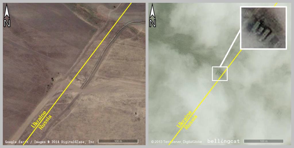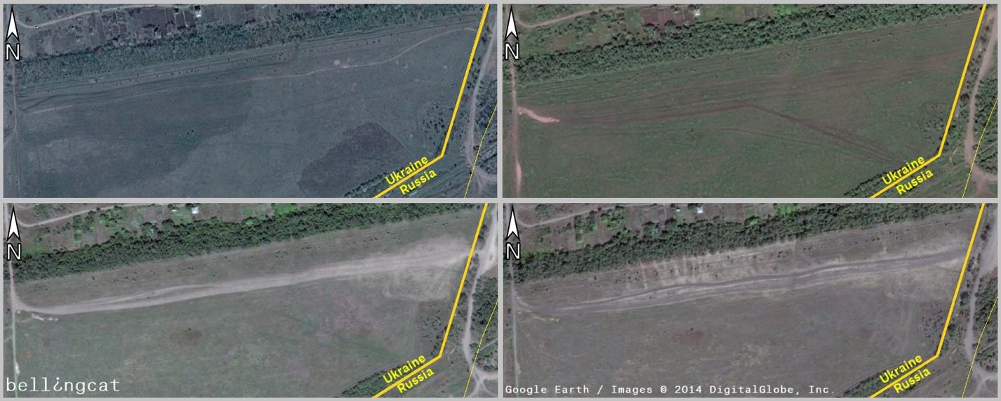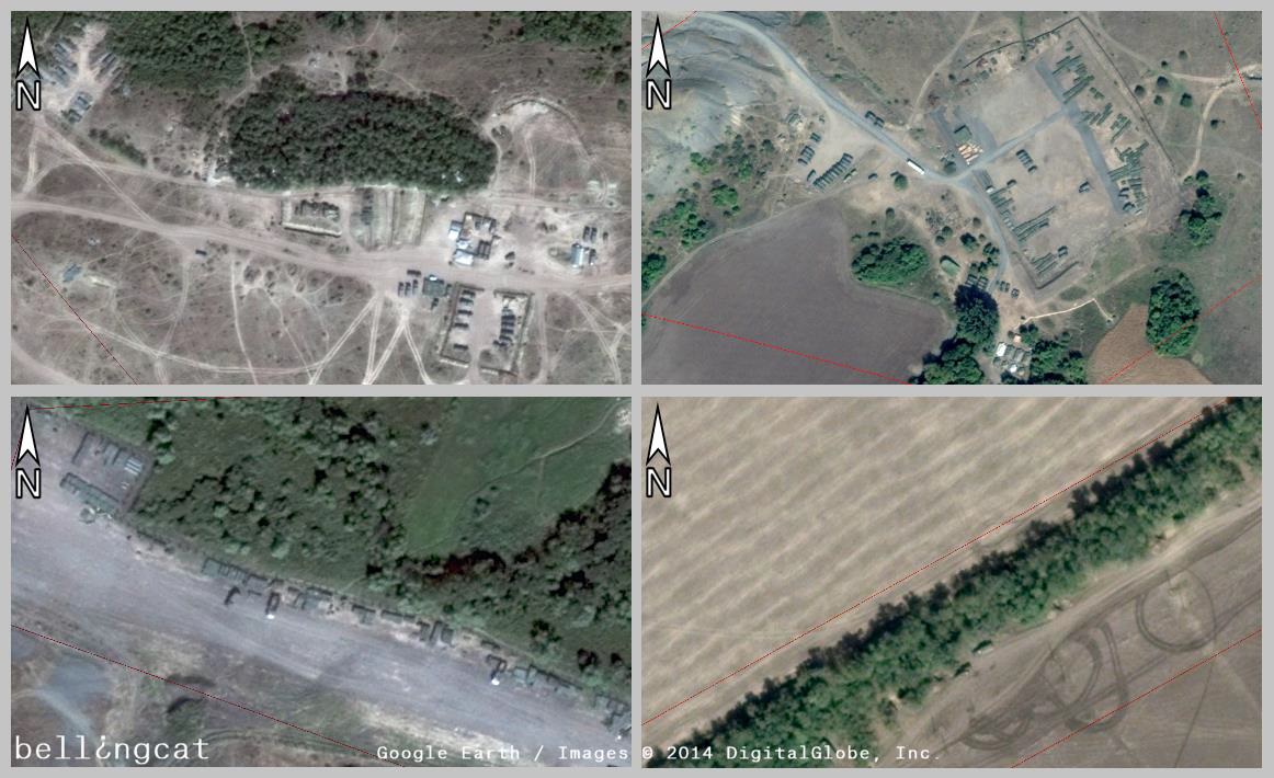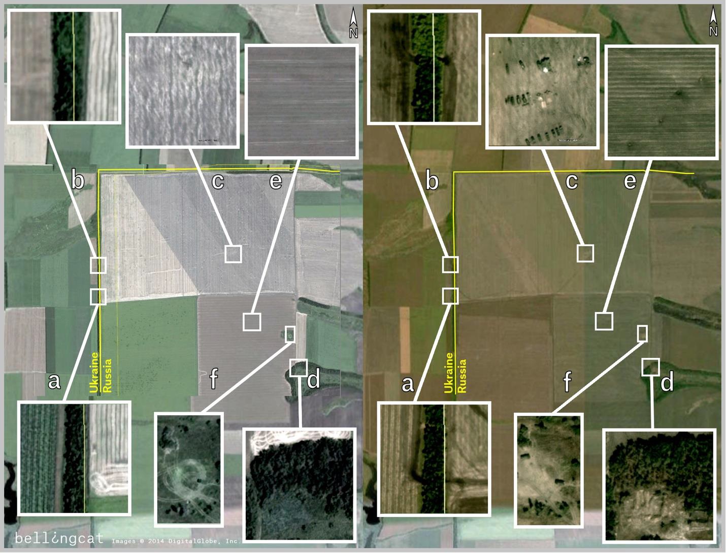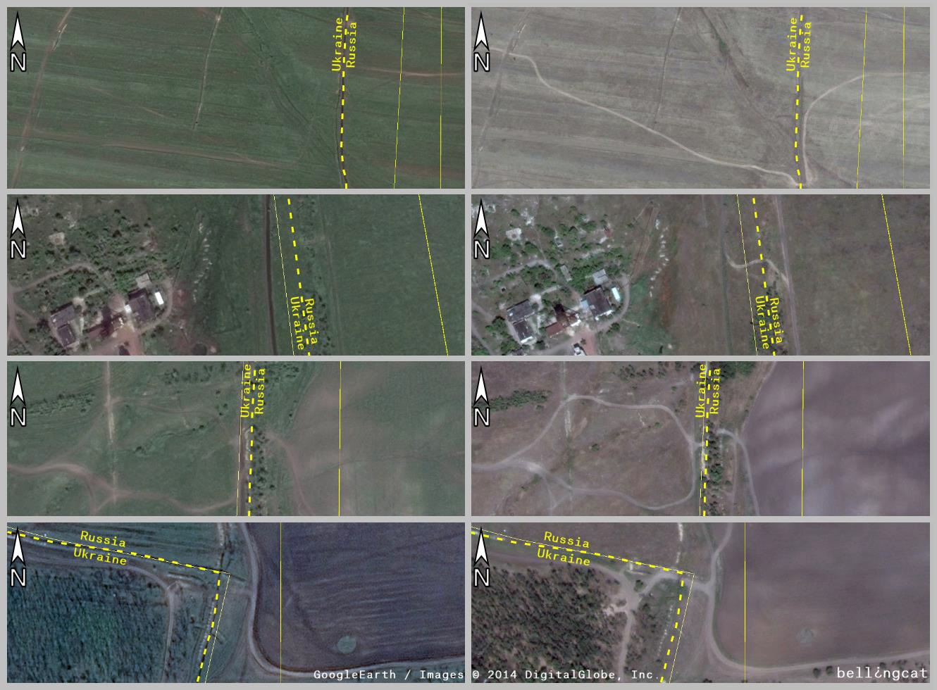 Сообщество волонтеров-расследователей Bellingcat, занимающееся поиском в открытых источниках свидетельств российской агрессии на Украине, опубликовало на своем сайте подробный анализ спутниковых карт с указанием мест на российско-украинской границе, где российские военные и техника перебрасывались из временных лагерей в Ростовской области на территорию Донецкой и Луганской областей Украины. Этот анализ, по мнению авторов расследования, позволяет судить о масштабе военной помощи России сепаратистам – выявлено около 60 неофициальных пограничных переходов, использование которых могло оказать переломное влияние на ход военных действий.