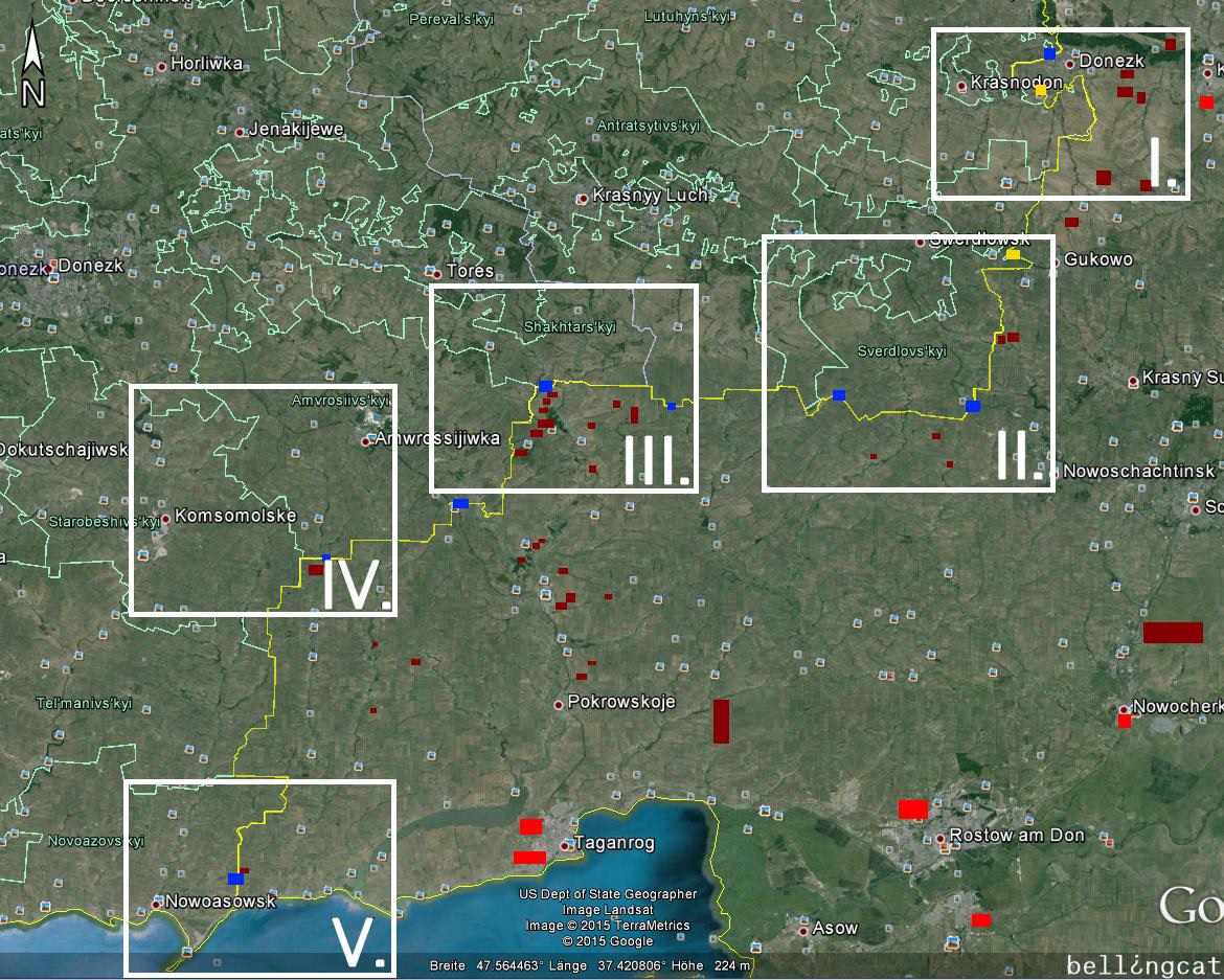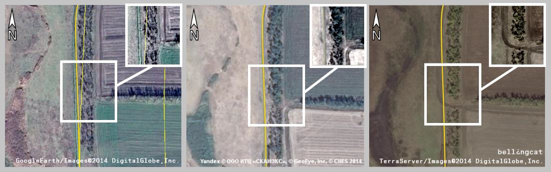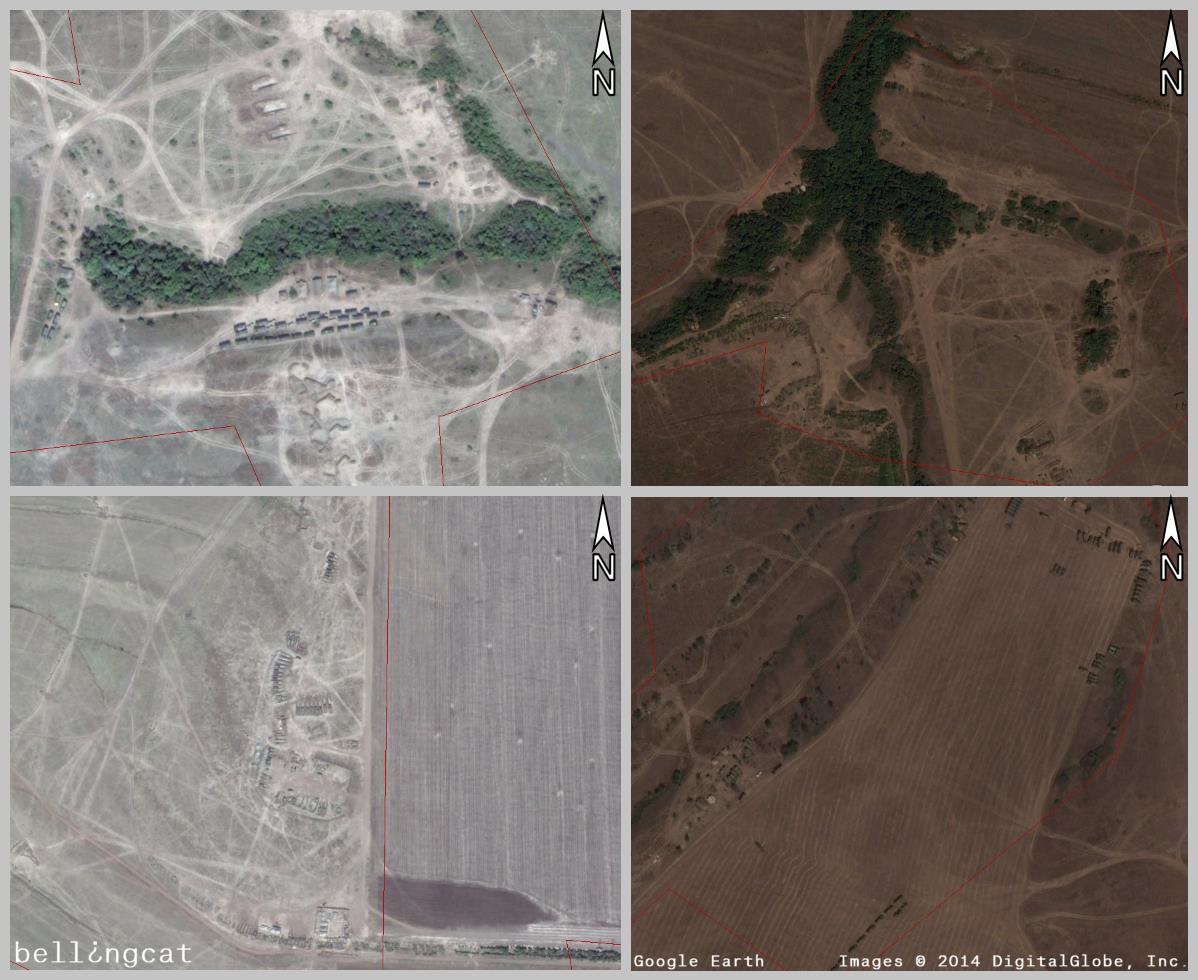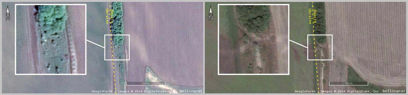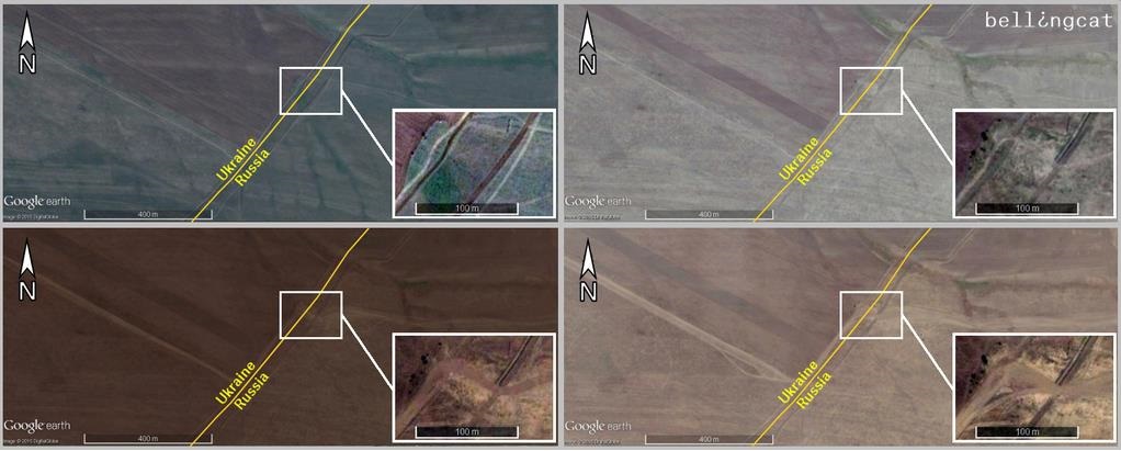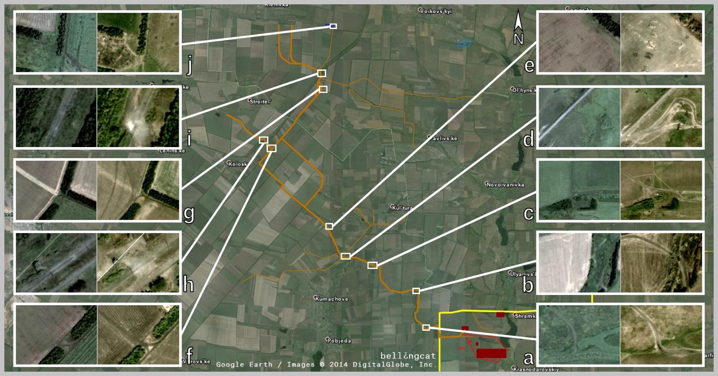 Сообщество волонтеров-расследователей Bellingcat, занимающееся поиском в открытых источниках свидетельств российской агрессии на Украине, опубликовало на своем сайте подробный анализ спутниковых карт с указанием мест на российско-украинской границе, где российские военные и техника перебрасывались из временных лагерей в Ростовской области на территорию Донецкой и Луганской областей Украины. Этот анализ, по мнению авторов расследования, позволяет судить о масштабе военной помощи России сепаратистам – выявлено около 60 неофициальных пограничных переходов, использование которых могло оказать переломное влияние на ход военных действий.