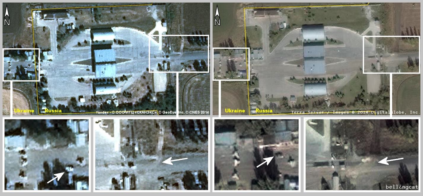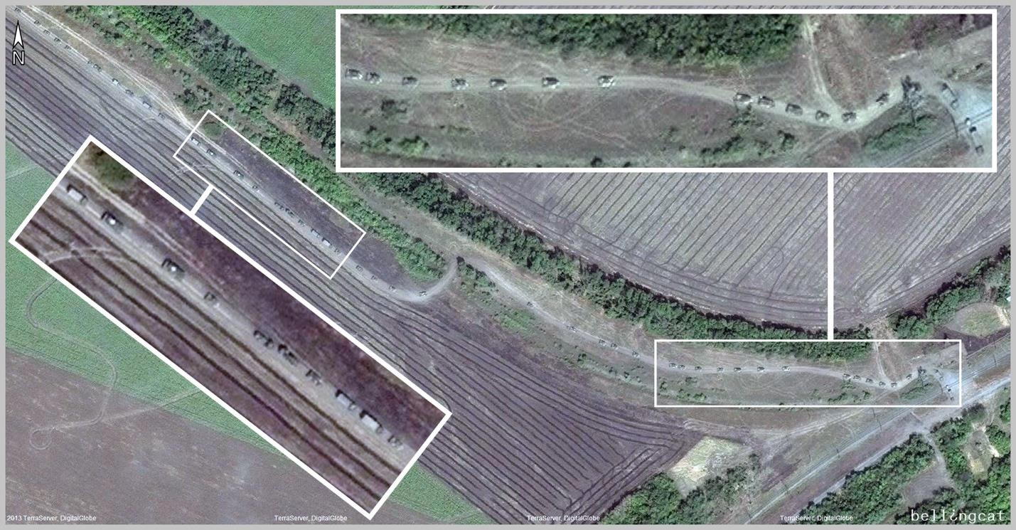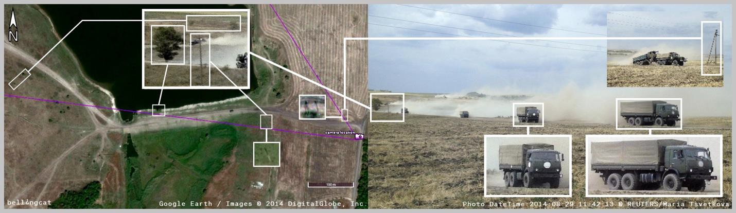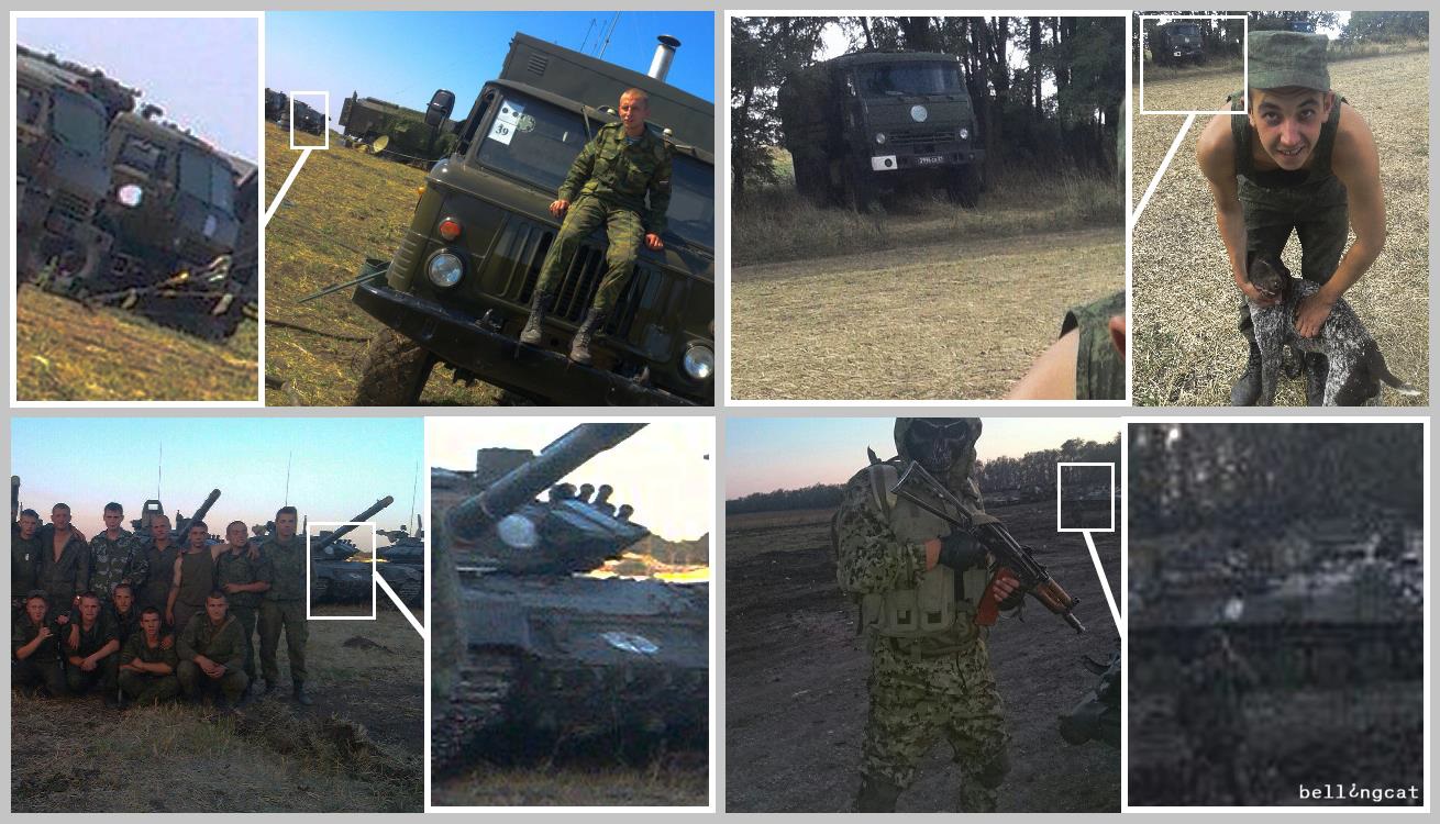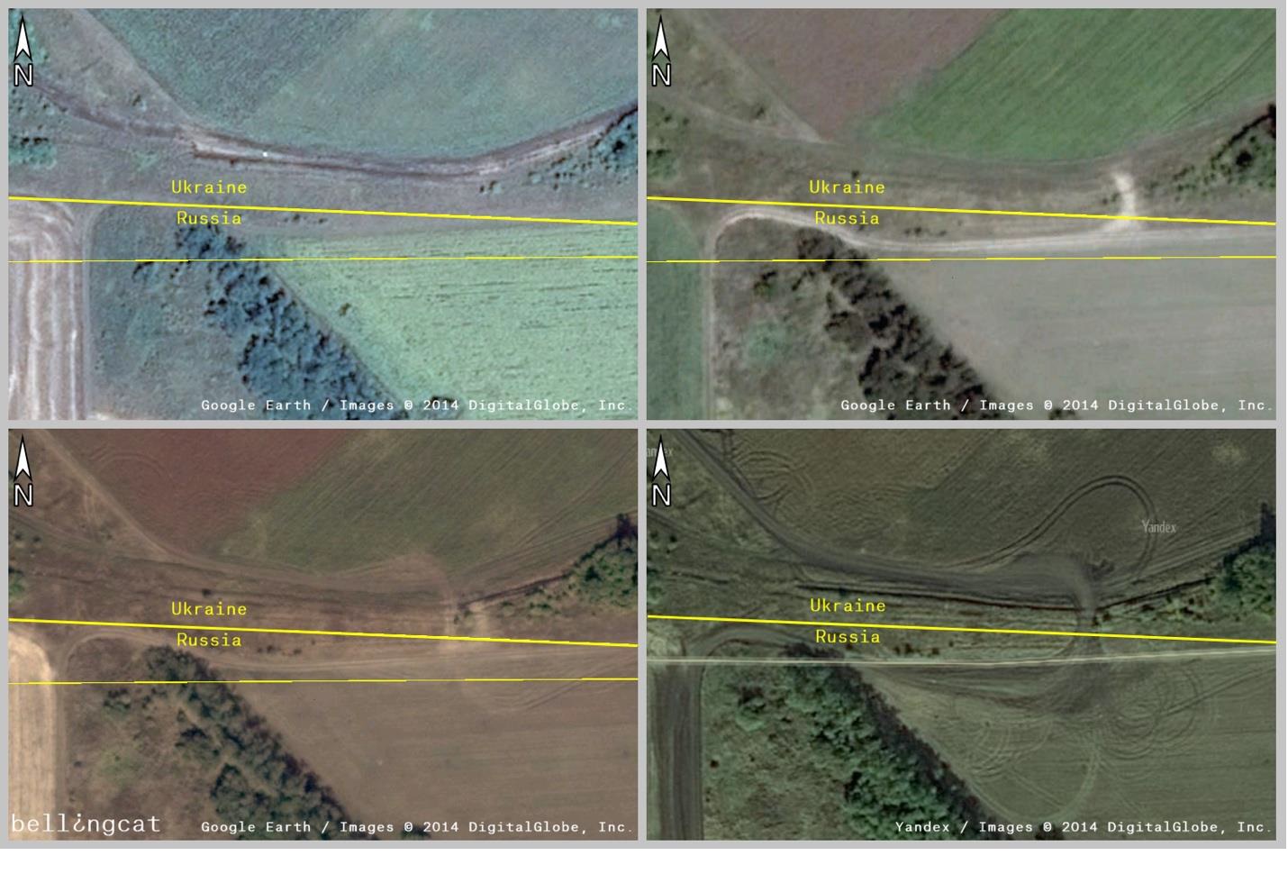 Bellingcat уже не раз публиковала отчеты и расследования, посвященные российско-украинскому конфликту. Самые известные из них посвящены ракетным комплексам "Бук", из которых мог быть сбит под Донецком "Боинг" Малайзийских авиалиний. Так, с помощью OSINT-разведки – по фотографиям в социальных сетях и общедоступным спутниковым снимкам – активисты группы проследили вероятные пути доставки "Буков" на Украину из России. Во время работы над этим расследованием и в дальнейшем было найдено несколько мест, где техника и солдаты незаконно переходили российско-украинскую границу. Их удалось вычислить по раскатанным тяжелой техникой колеям, которые видны на снимках лета 2014 года, но отсутствуют на более ранних спутниковых изображениях. Иногда на снимках видна и сама техника.