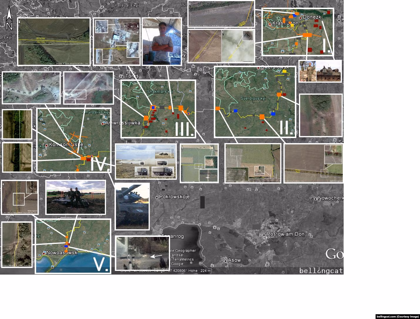 Для наглядности Bellingcat разделил российско-украинскую границу на пять зон, "привязав" каждую к ближайшему населенному пункту в России. В расследовании приводятся спутниковые снимки из всех пяти зон и фотографии из аккаунтов российских солдат в социальных сетях, сделанные как в Ростовской области, так и на территориях "ДНР" и "ЛНР".