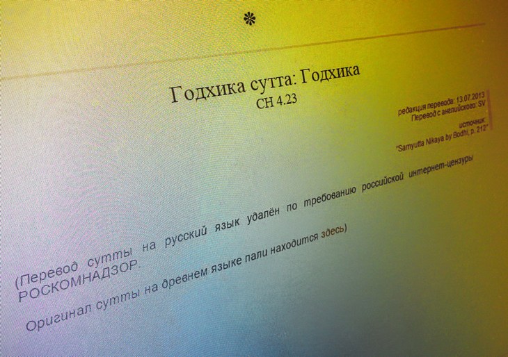 «В соответствии с требованиями Роскомнадзора мы вынуждены убрать некоторые сутты с сайта т.к. по мнению экспертов данной организации в словах Будды содержится пропаганда самоубийства.