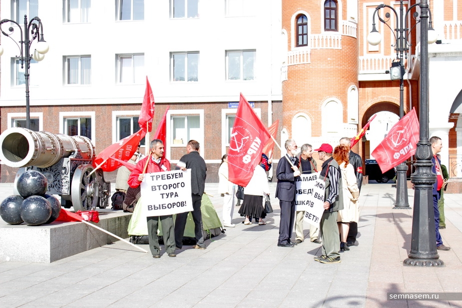В полдень на площади Оболенского-Ноготкова активисты КПРФ установили палатку, развернули красные знамена. Все проходящие по площади горожане могут убедиться в причине протеста: лозунги, которые держат пикетчики, информируют о победе Сергея Мамаева в Йошкар-Оле, требуют привлечь к ответственности фальсификаторов и провести второй тур выборов главы региона. Пикет коммунистов на площади продлится практически весь день.