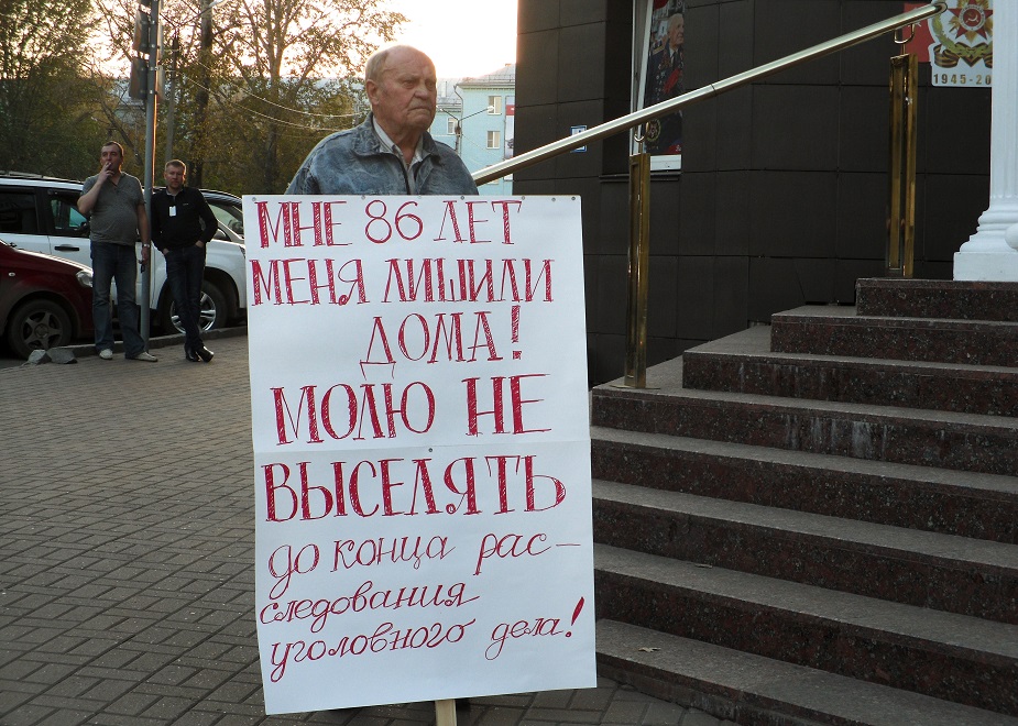 Ветеран Иван Кушов держит в руках плакат с надписью: «Мне 86 лет, меня лишили из дома! Молю не выселять до конца расследования уголовного дела». Сотрудники областного суда, выходя из здания, под конец рабочего дня лишь проходят мимо, внимания на него обращают.