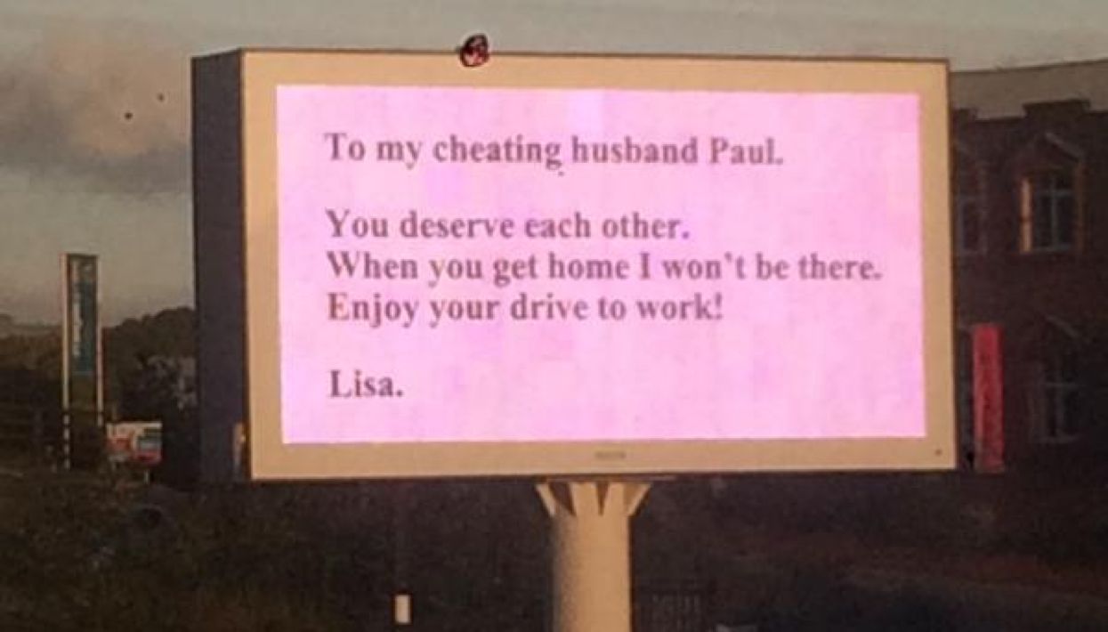 Жительница британского города Шеффилд решила отомстить своему мужу за измену, разместив послание на баннере, стоящем у дороги, по которой он ездит на работу. На электронном табло было написано: «Моему мужу-изменнику Полу. Вы друг друга стоите. Когда ты вернешься домой, меня там уже не будет. Приятной дороги на работу! Лиза».