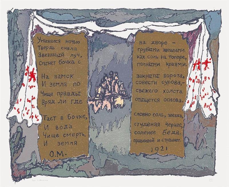 Художник Ситсе Баккер посвятил Мандельштаму серию гравюр. Стихотворные строфы, старательно вырезанные не говорящим по-русски Баккером, с танцующими на манер берестяных грамот буковками, становятся частью композиции. Баккера особенно привлекают наивные, шуточные стихи Мандельштама, но в этом его арт-наиве, в детской чистоте, в которую он обрамляет даже самые горькие сочинения поэта 30-х годов, есть и пронзительная боль, как от фотографии с мертвым детским телом. Сам Мандельштам у Баккера – это часть ландшафта. Он – и свет, и земля, уже поросшая первой травой.