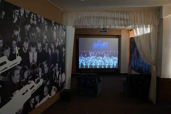 © Colta.ru Чирич решила вполне серьезно провести мобилизацию. На первом этаже у нее разместилась просторная комната с множеством стульев, рисунков и иных объектов — это конференц-зал, созданный сербским художником Синишей Иличем, который называет его «публичным местом», а «посетители приглашаются использовать его в любое время» — на их усмотрение, конечно. Далее, поднявшись на два следующих этажа, зрители получают все новые и новые заряды этой мобилизационной логики: картины Светланы Шуваевой с главным персонажем — бесчисленными безликими толпами; видео Полины Канис, в одном из которых она бодро руководит группой людей, занимающихся в парке зарядкой; фильм сербских художниц Марты Попиводы и Аны Вуянович про масштабное празднование Дня молодежи в Югославии в 1987 году, когда эта страна уже дышала на ладан, но пропаганда работала все так же; фильм и инсталляцию Марыси Левандовской из Польши о том, как модернистский призыв к «новому быту» работает в реальном мире (на примере австрийского архитектора Маргарете Шютте-Лихоцки); истории на тему самоорганизации бедных крестьян из Латинской Америки от бразильского художника Джонатаса де Андраде и многое другое. А скрепляется это все двумя проектами — панк-агитацией Алисы Йоффе, расписавшей стены в коридорах, и перформансом французского дуэта Les gens d'Uterpan: группа молчащих людей медленно перемещается по гостинице, выбирает жертв среди зрителей и начинает за ними пристально наблюдать. (Был еще и третий такой проект, но очень специфический, поэтому о нем позже.)