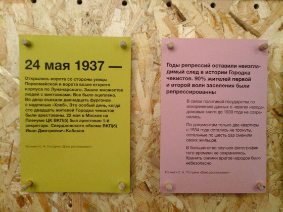 © Colta.ru Фрагмент таймлайна исследовательского проекта «Городок чекистов: от утопии к авангарду» На последнем этаже в одной из комнат разместился книжный магазин, помимо основного предназначения бывший штаб-квартирой группы австралийских художников 3ply — они в рамках проекта «Примечания» при поддержке Чирич разрабатывали альтернативный гид по биеннале, который тоже как бы покрывал сетью обсуждений и расследований все здание. Окружал их, вероятно, главный проект, не относящийся к основной части биеннале, — выставка исследовательской группы, которая занималась историей Городка чекистов (куратор — Илья Шипиловских). Через весь коридор последнего этажа гостиницы идет таймлайн с основными вехами, там же приводятся факты и цифры. Например, о репрессиях, которым в 1930-х подверглись жители этого комплекса — чекисты и их семьи. Тут же лиричные истории — как в случае архитектора Георгия Катугина, бывшего, скажем так, наивным художником по совместительству. На мой вопрос, будет ли эта драматическая история с конца 1920-х по настоящий день как-то зафиксирована в книге, Илья грустно улыбнулся, потому что явно все финансы уже ушли на биеннале; а ведь было бы хорошо, если бы об истории Городка чекистов узнали не только в Екатеринбурге — тем более сейчас.