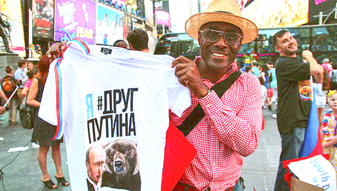Такие футболки получили победители викторины «Узнай Россию», которую проводила «Русская молодежь Америки», Нью-Йорк, Таймс-Сквер, июнь 2015 года