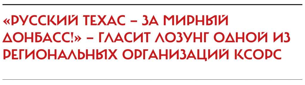 «Русский Техас — за мирный Донбасс!» — гласит лозунг одной из региональных организаций КСОРС. Лозунг появился неспроста. В 2006 году, когда правительство России начало проект финансовой поддержки соотечественников за рубежом, его целью провозглашалось сохранение языка и культуры, а также связей иммигрантов с исторической родиной. МИД РФ определял годовой бюджет на финансирование диаспоры в размере 300–400 млн руб. — на чтение стихов Пушкина, выставки русских художников, детские концерты, блины и хороводы