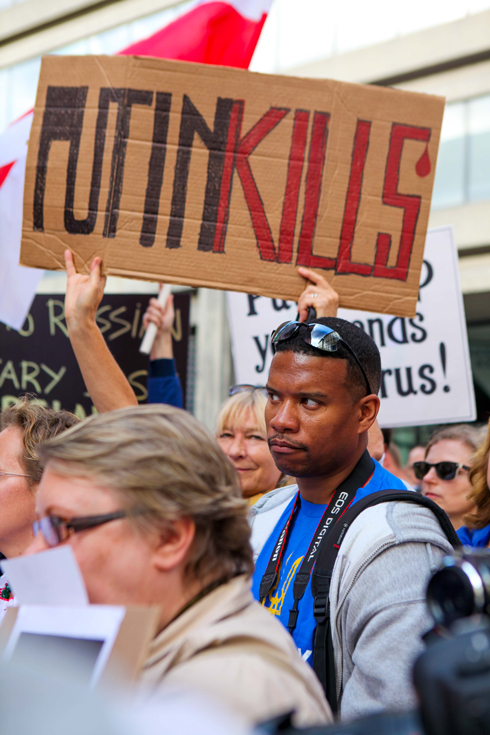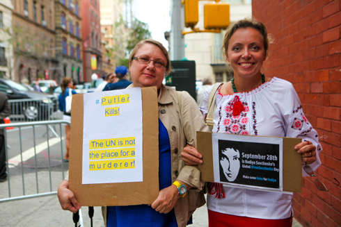 Многие протестующие пришли и к зданию, в котором проходит заседание Генеральной ассамблеи ООН, в то время, как там выступал Владимир Путин.