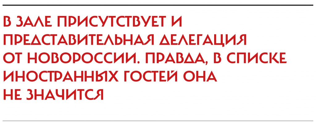 В зале присутствует и представительная делегация от Новороссии. Правда, в списке иностранных гостей она не значится.