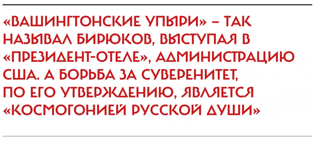 № 10 от 30 марта 2015 года). Как и на нынешней конференции, в Питере собирался «правый интернационал» — политики с антиамериканскими и антилиберальными взглядами. «Вашингтонские упыри» — так называл Бирюков, выступая в «Президент-Отеле», администрацию США. А борьба за суверенитет, по его утверждению, является «космогонией русской души».