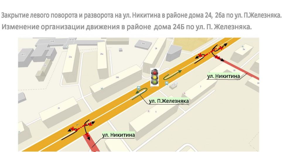 Также будет закрыт левый поворот и разворот на ул. Никитина в районе дома 24, а также дома 26а по ул. Партизана Железняка.