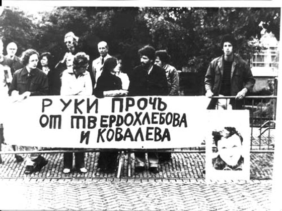 © семейный архив Демонстрация в защиту Ковалева и Твердохлебова (предположительно в Нью-Йорке), 1975 г. Откуда безумная, казалось бы, надежда, что «строительство идеала» ничтожной кучкой людей, разбросанных по земному шару, сможет повлиять на «крота истории»?