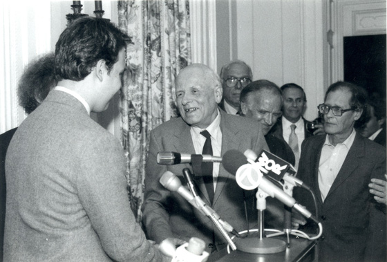 © семейный архив C Андреем Сахаровым в Нью-Йорке, в Академии наук, 1988 г. В суде дело было так. Скамья подсудимых, перед ней столик, на нем бумаги. Все толпятся, конвой хлопочет, суматоха. Тут Виля, жена Револьта, говорит: «У меня шоколадка, хочу ее мужу дать, пустите меня, видите, шоколадка, ничего больше нет». Начинается женский базар, ее в конце концов пускают, она сует Револьту шоколадку, а сама берет эти бумаги. Отходит и наталкивается на Сахарова. «Андрей Дмитриевич, спрячьте, вас не будут обыскивать». Он берет и сует в карман. Потому он так быстро и убежал.