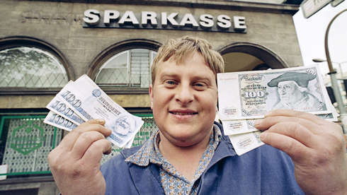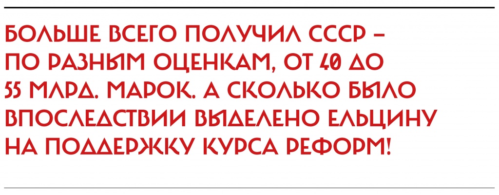Михаил Горбачев на церемонии открытия своего бюста, Берлин, 9 ноября 2009 года Коль верил в свои пророчества, что «восток встанет на ноги через три-четыре года». И потому всемерно ускорял заключение разорительного валютно-экономического союза между ФРГ и ГДР, в соответствии с которым с 1 июля восточная марка менялась на западную по фантастическому курсу: сумма до 4 тыс. (пенсионерам — до 6 тыс.) — один к одному, свыше — два к одному (за месяц до этого реальный «рыночный» курс был 10:1). Какие при этом проворачивались гигантские махинации и сколько это стоило экономике его страны еще до реального объединения, канцлера, вероятно, интересовало мало: люди в ГДР, считал он, должны были на своем кошельке почувствовать преимущества грядущего единства. Как-то Коль в том же 1990 году сказал (об этом свидетельствуют документы из ведомства федерального канцлера): «Все в конце концов упрется в наличные». Так, в общем-то, и оказалось. ФРГ выделила «больше, чем ожидалось» на военную операцию в Персидском заливе, чем ублажила американцев. А до этого был предоставлен полумиллиардный кредит Венгрии за открытие границ с Австрией. Но больше всего получил СССР — по разным оценкам, от 40 до 55 млрд марок. А сколько было впоследствии выделено Ельцину на поддержку курса реформ!