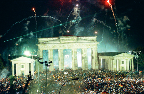 Салют над Бранденбургскими воротами в день объединения Германии, Берлин, 3 октября 1990 года В ночь на 3 октября 1990 года прожекторы, установленные на вышках у английской военной комендатуры в берлинском парке Тиргартен, били по Рейхстагу. А потому на стенах здания даже на расстоянии были видны выбоины от снарядов и пуль, оставшиеся после войны. На трибуне вдоль всего фасада теснились старые и новые соратники немецкого канцлера Гельмута Коля, только что приведшего обе Германии к единству.