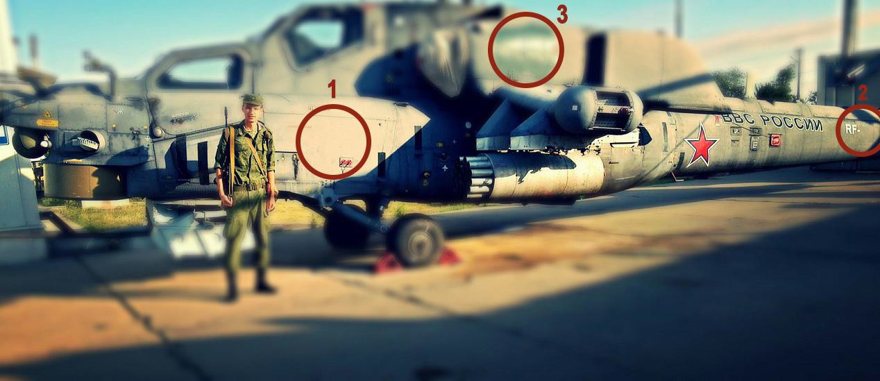 Если сравнить фотографию из социальной сети с другими снимками "Ми-28Н", видно, что на снимке из Крымска у вертолета закрашен бортовой номер (1), отсутствует регистрационный номер (2), закрашена маркировка на корпусе левого двигателя (3). О том, что вертолет Ми-28Н, на фоне которого сфотографировался Петр Гордиенко, подготовлен к транспортировке, можно судить по снятым с него винтам.