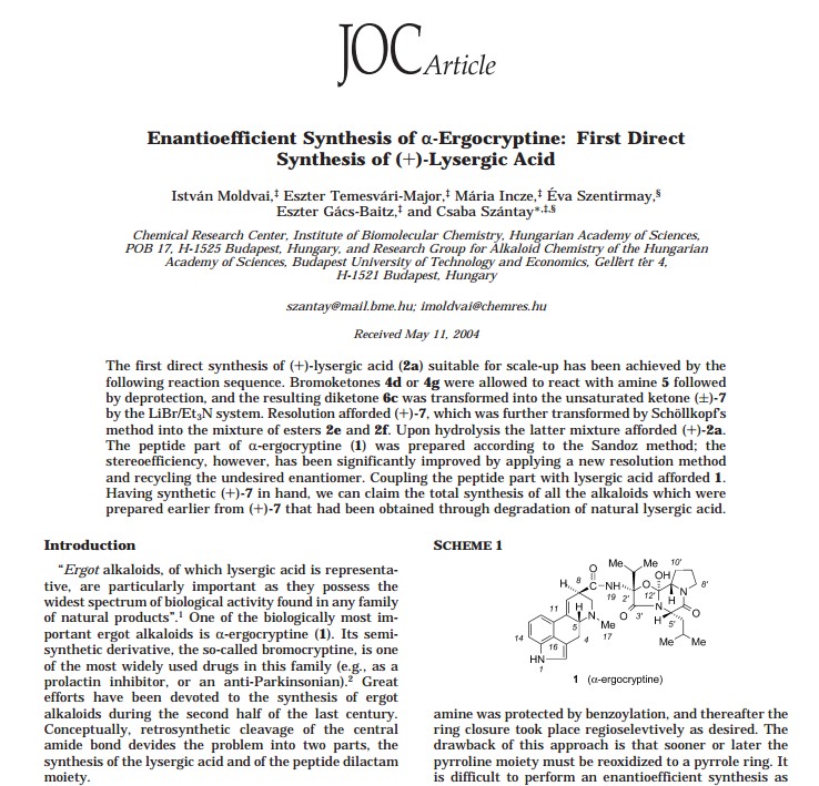 Исследование носит наименование «Enantioefficient Synthesis of r-Ergocryptine: First Direct Synthesis of (+)-Lysergic Acid» и было опубликовано в 2004 году в научном издании JOC — The Journal of Organic Chemistry в 2004 году.