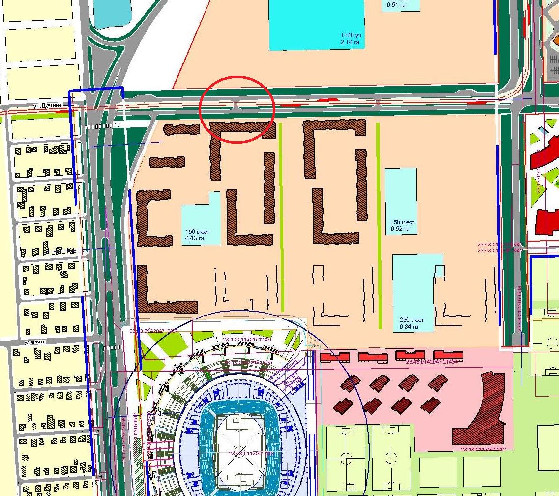А теперь фарс. 24 сентября 2015 года администрацией Краснодара было принято постановление об утверждении проекта планировки жилого района, примыкающего ко всё той же улице Восточно-Кругликовской, но уже в месте будущего футбольного стадиона «Краснодар». Проектом предусмотрена (и утверждена в Генплане ещё в 2014 году) прокладка трамвайной линии от улицы Красных Зорь через Новосельский проезд (со сносом частного сектора), пересекая Восточно-Кругликовскую и далее по «улице Проектируемой» между домами ЖК «Панорама» с поворотом на север на улицу Героев Разведчиков. Посмотрите, как всё красиво выглядит на картинке: