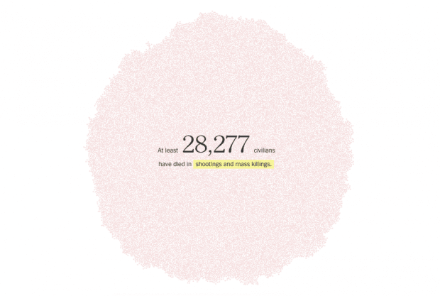 The New York Times подготовили материал, который наглядно показывает число погибших во время гражданской войны в Сирии с марта 2011 года по август 2015 года. На визуализации каждая точка – это человек, который был убит во время конфликта.