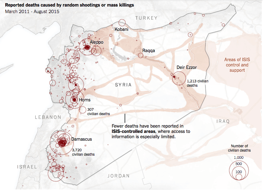 В материале The New York Times приводятся следующие зарегистрированные данные о числе погибших мирных жителей во время гражданской войны в Сирии (до августа 2015 года):