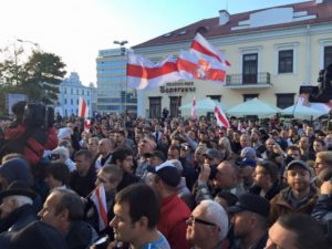 Собравшиеся подняли вверх бело-красно-белые флаги белорусской оппозиции, флаги