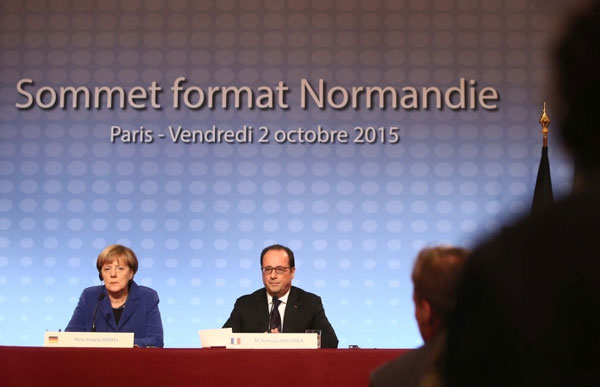 Заключительная пресс-конференция Ангелы Меркель и Франсуа Олланда. Фото: elysee.fr- Усиление ОБСЕ. В Украину прибудут новые наблюдатели в большем количестве. Москва гарантировала полный доступ наблюдателей ко всем объектам инфраструктуры на оккупированной территории Донбасса. Украина настояла, чтобы наблюдатели имели полный доступ также к захваченному отрезку украинско-российской границы.