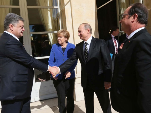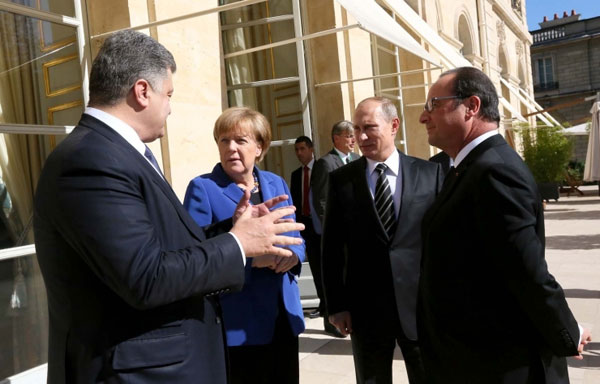 Переговорщики: П.Порошенко, А.Меркель, Ф.Олланд, В.Путин. Переговоры шли больше четырех часов, после чего Путин первым покинул Елисейский дворец, не ответив на вопросы журналистов. Порошенко позже сделал заявление для СМИ из посольства Украины. На итоговой пресс-конференции выступили Олланд и Меркель, но общую картину из их сообщений понять было нельзя.