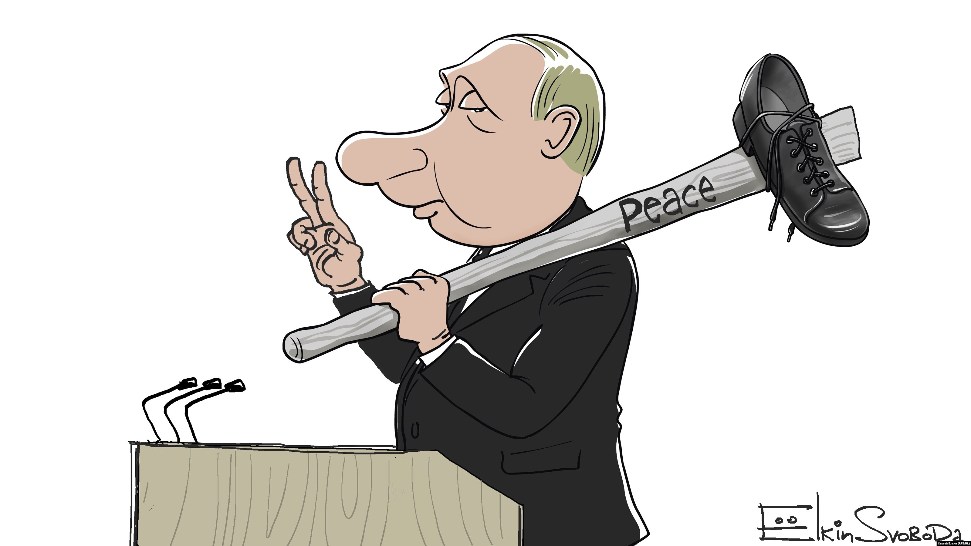 Когда президент России в конце сентября отправлялся на Генеральную Ассамблею ООН, карикатурист Сергей Елкин нарисовал Владимира Путина на трибуне с дубиной с надписью "мир", к которой приторочен башмак.